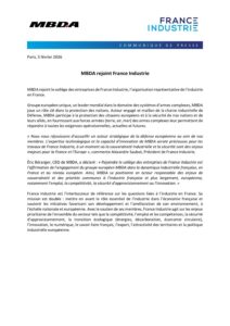 « Nous nous réjouissons d’accueillir un acteur stratégique de la défense européenne au sein de nos membres. L’expertise technologique et la capacité d’innovation de MBDA seront précieuses pour les travaux de France Industrie, à un moment où la souveraineté industrielle et la sécurité sont des enjeux majeurs pour la France et l’Europe », commente Alexandre Saubot, Président de France Industrie.